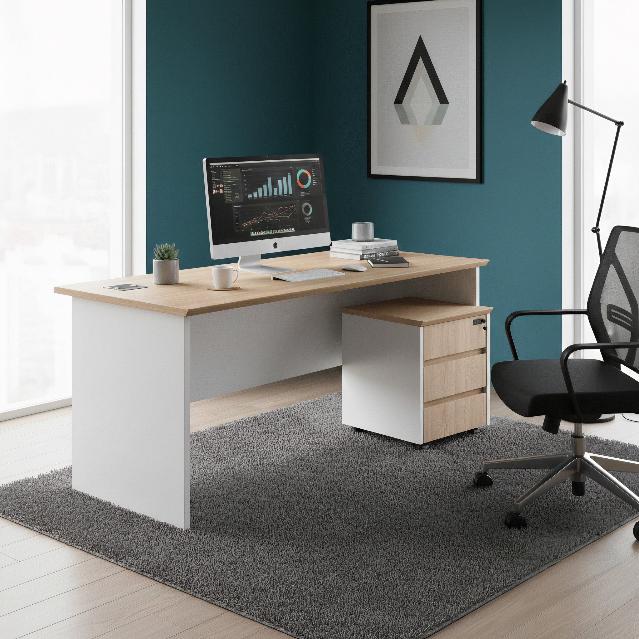 This modular desk offers a clean, modern workspace for any office. The wide work surface with cable cutouts keeps your setup neat, while the matching mobile three-drawer cabinet provides convenient storage for files and supplies. Its light oak top and white panel design deliver a fresh, professional look.