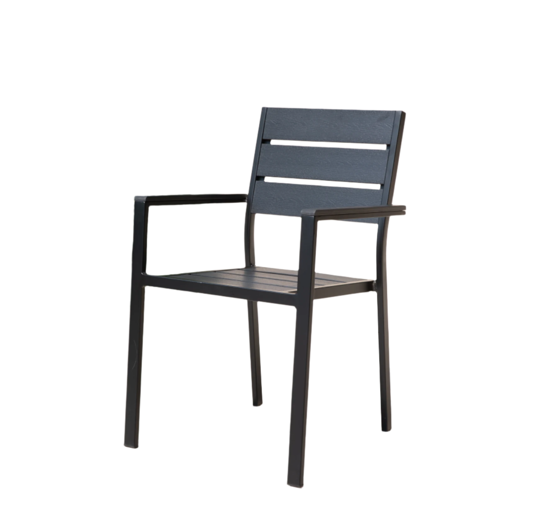 This outdoor chair combines modern aesthetics with practical durability, featuring an aluminum frame and plastic wood slats on the backrest, seat, and armrests. Finished with a protective powder coating, it is designed to resist the elements and maintain its sleek appearance over time. The plastic wood slats provide the look of natural wood with the low-maintenance benefits of composite materials. Ideal for patios, decks, or garden spaces, this chair offers a clean, contemporary seating option built for outdoor living.