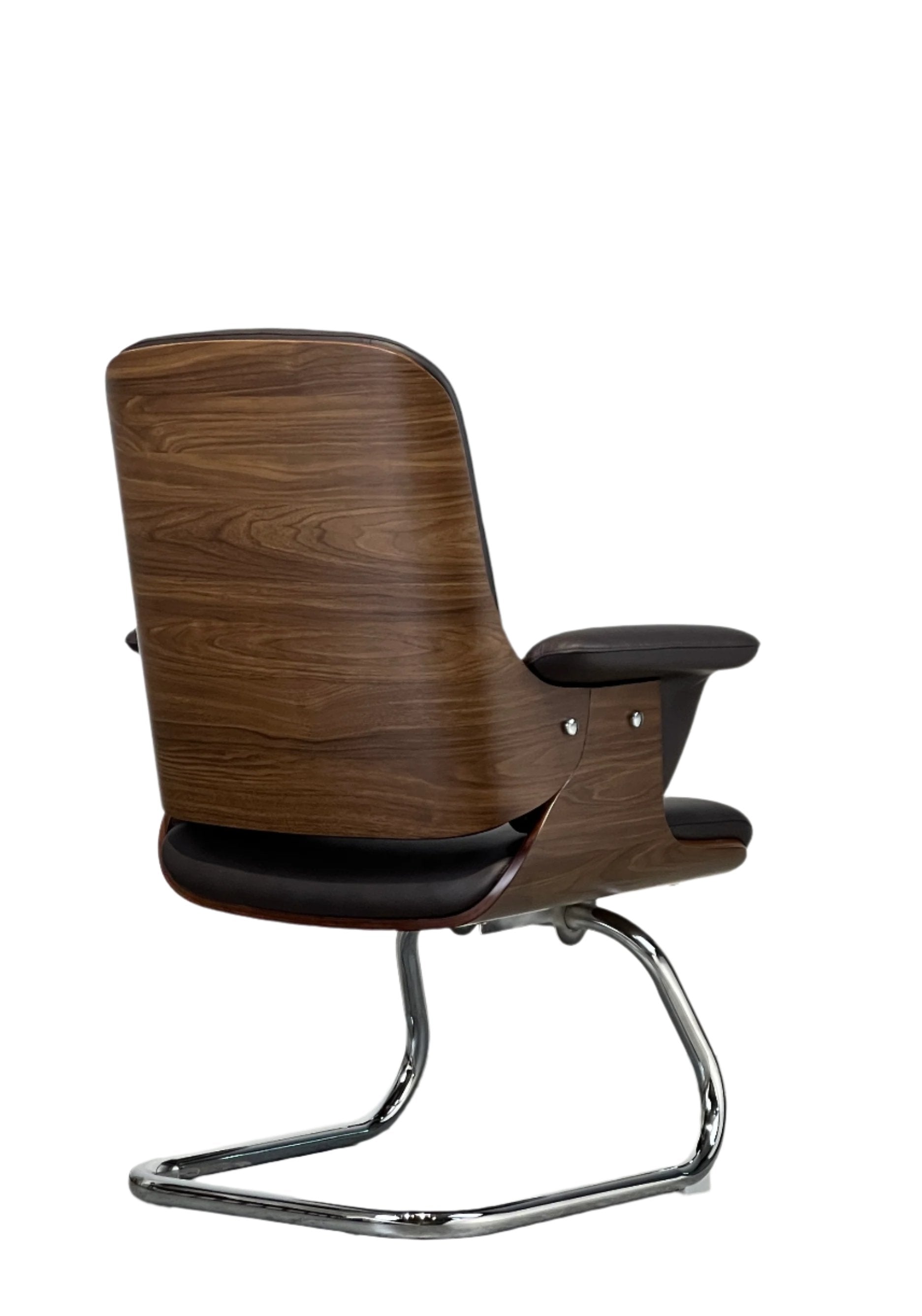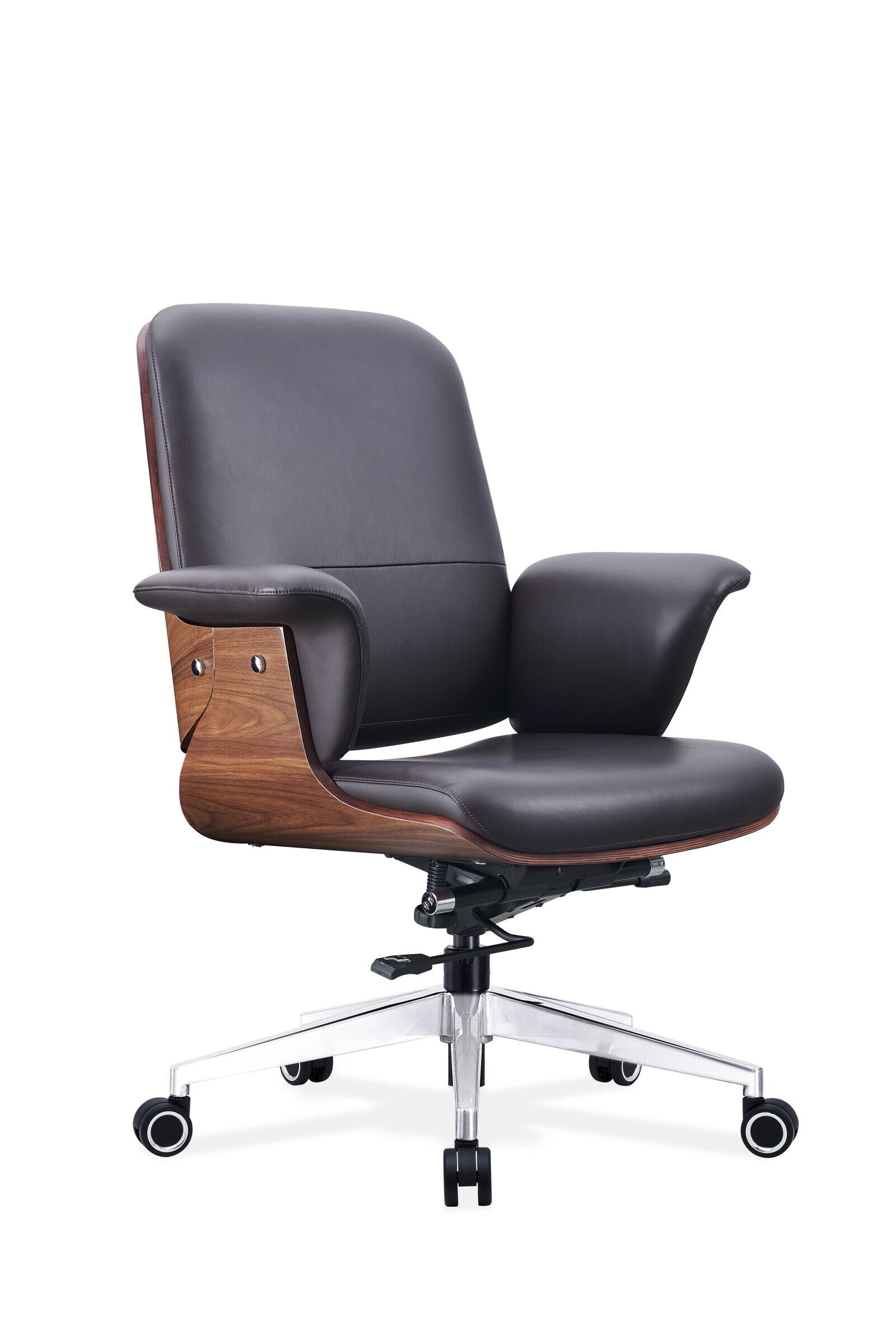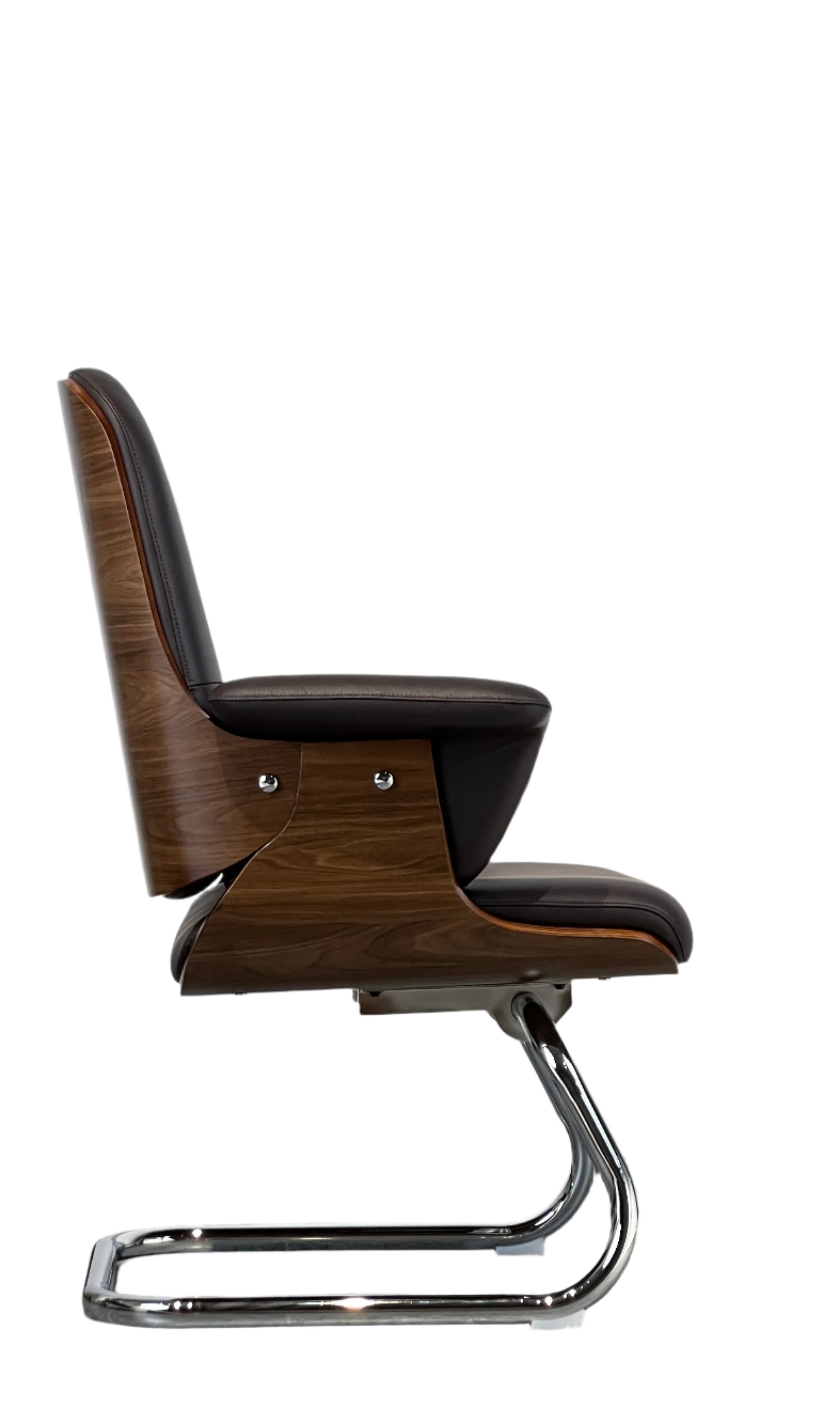 Bring a blend of elegance and comfort to your workspace with this faux leather upholstered office chair. Featuring a stylish curved wood back shell and chrome finishes, this chair offers both sophistication and support. Choose between roller casters for mobility or a stationary cantilever base for a more fixed position. The height adjustability and padded armrests ensure optimal comfort for long hours at your desk.