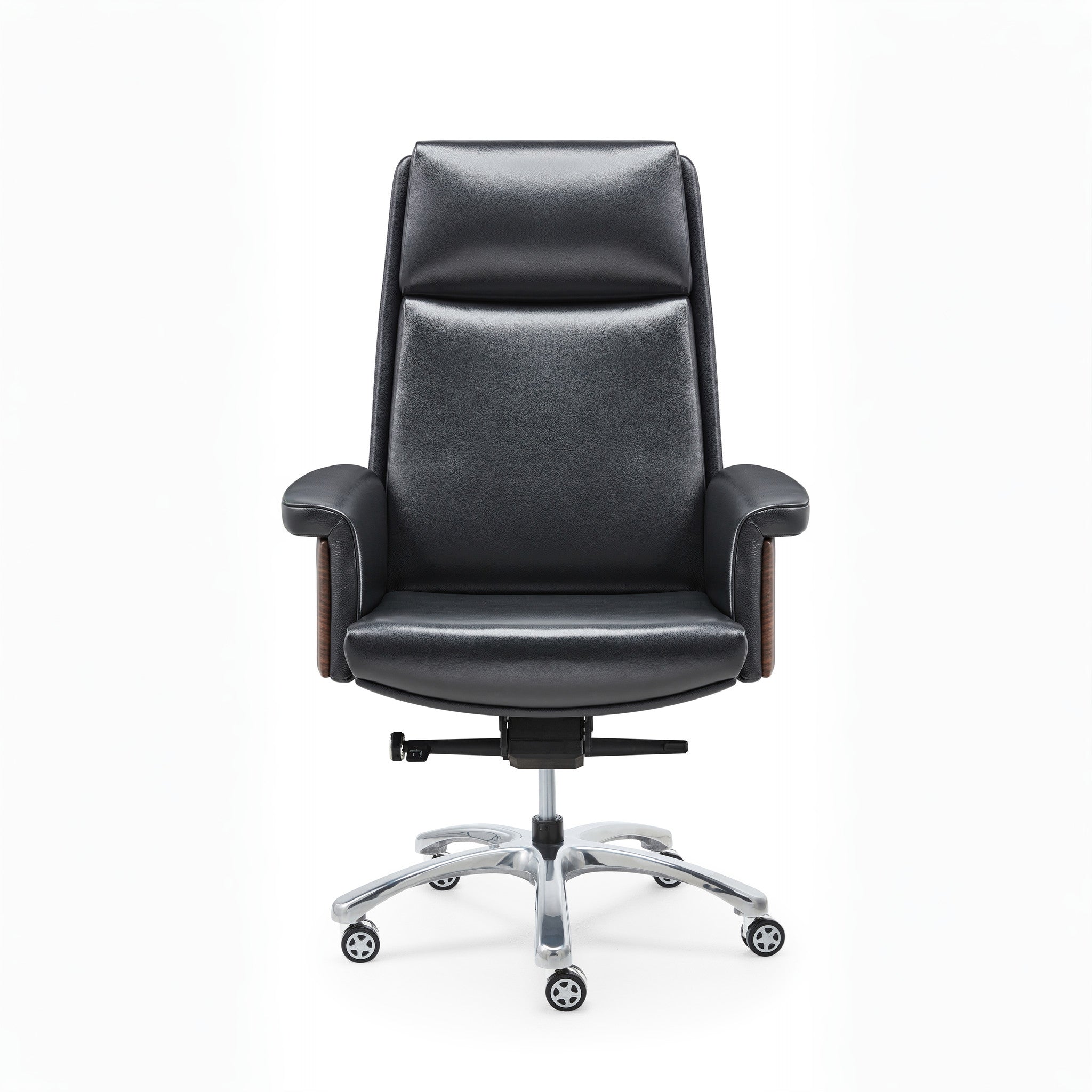 Upgrade your office with this genuine leather executive chair that blends comfort, function, and refined style. The high backrest with built-in headrest offers excellent lumbar support, while the adjustable height and smooth swivel deliver personalized comfort. Finished with an elegant wood back shell and durable casters, it’s built for both luxury and daily use.