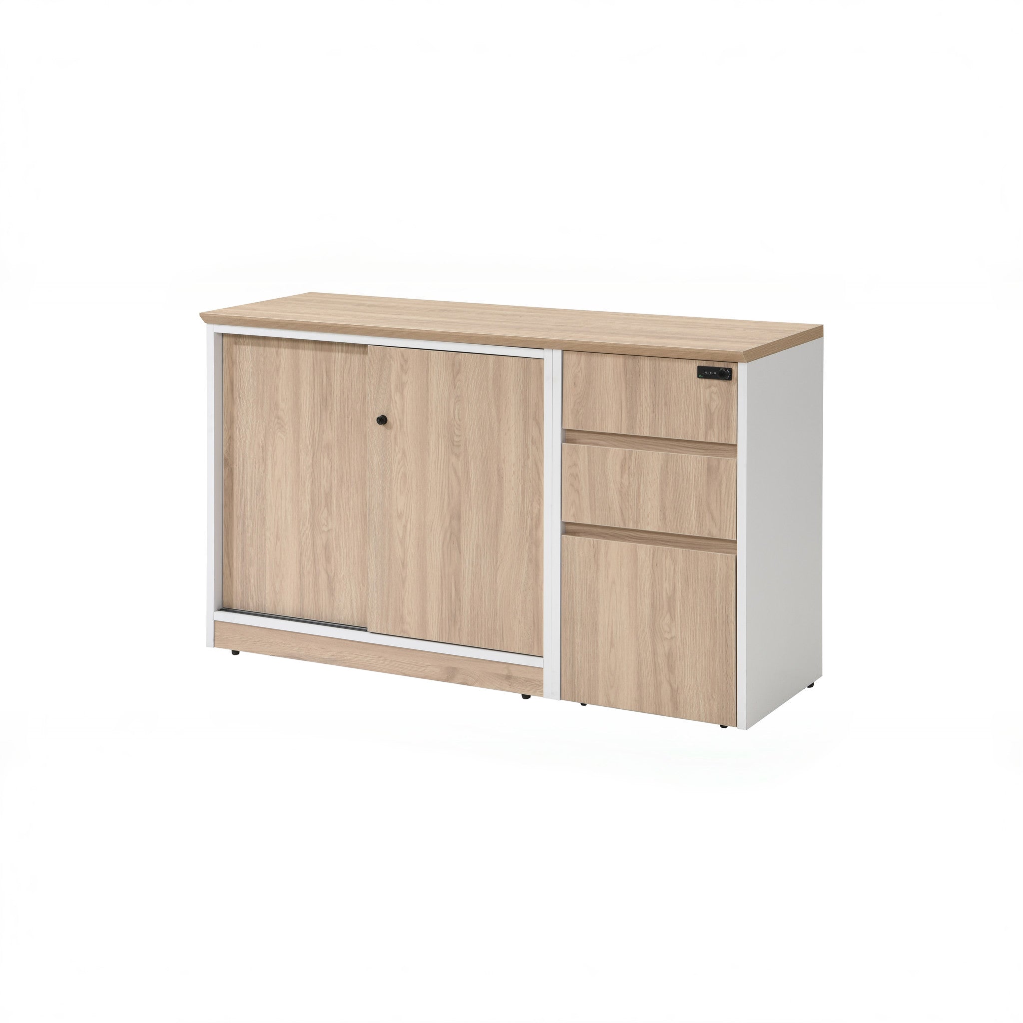 Keep your workspace neat and organized with this stylish and functional office storage cabinet. Featuring a sleek light oak finish with white accents, it offers both open and concealed storage options, including sliding doors and three convenient drawers—perfect for files, supplies, and more.