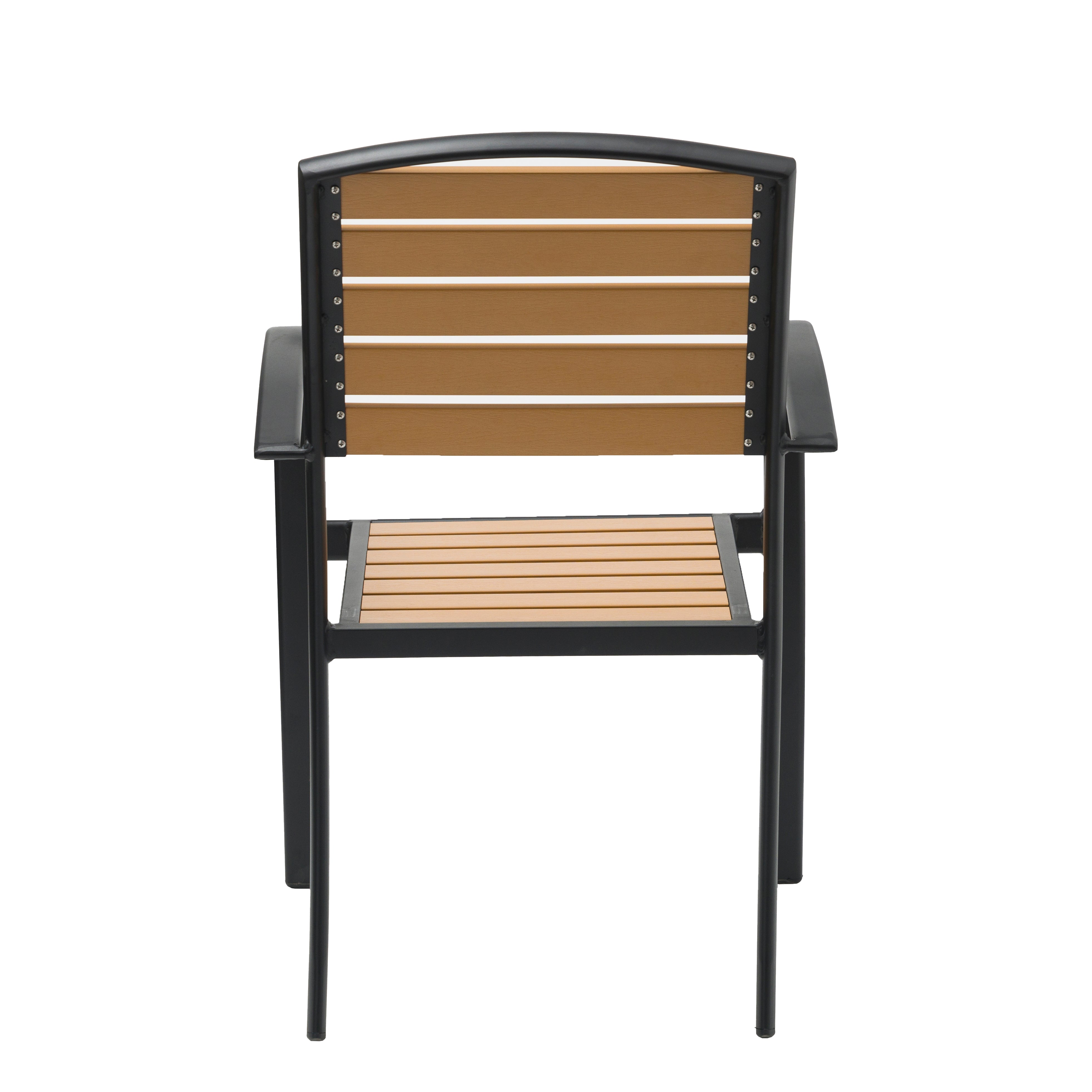 Designed for durability and style, this outdoor armchair features a sturdy black aluminum frame paired with plastic wood slats on the backrest, seat, and armrests. The slats replicate the look of real wood while offering superior resistance to weather, fading, and wear. A sleek powder-coated finish protects the frame and enhances its modern appeal. Ideal for patios, balconies, or garden seating areas, this chair combines comfort, easy maintenance, and contemporary design in one practical piece.
