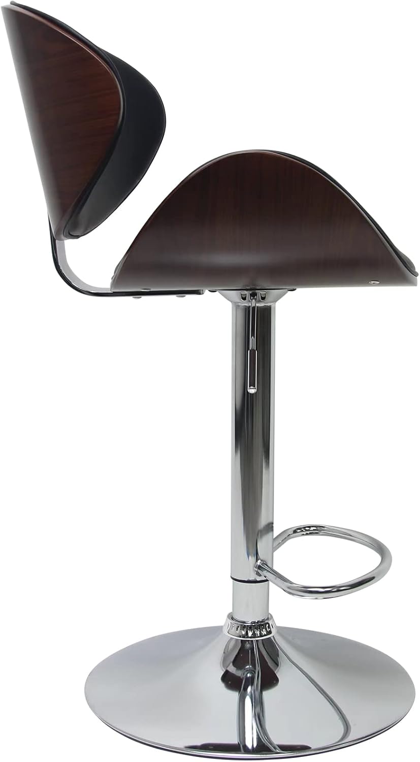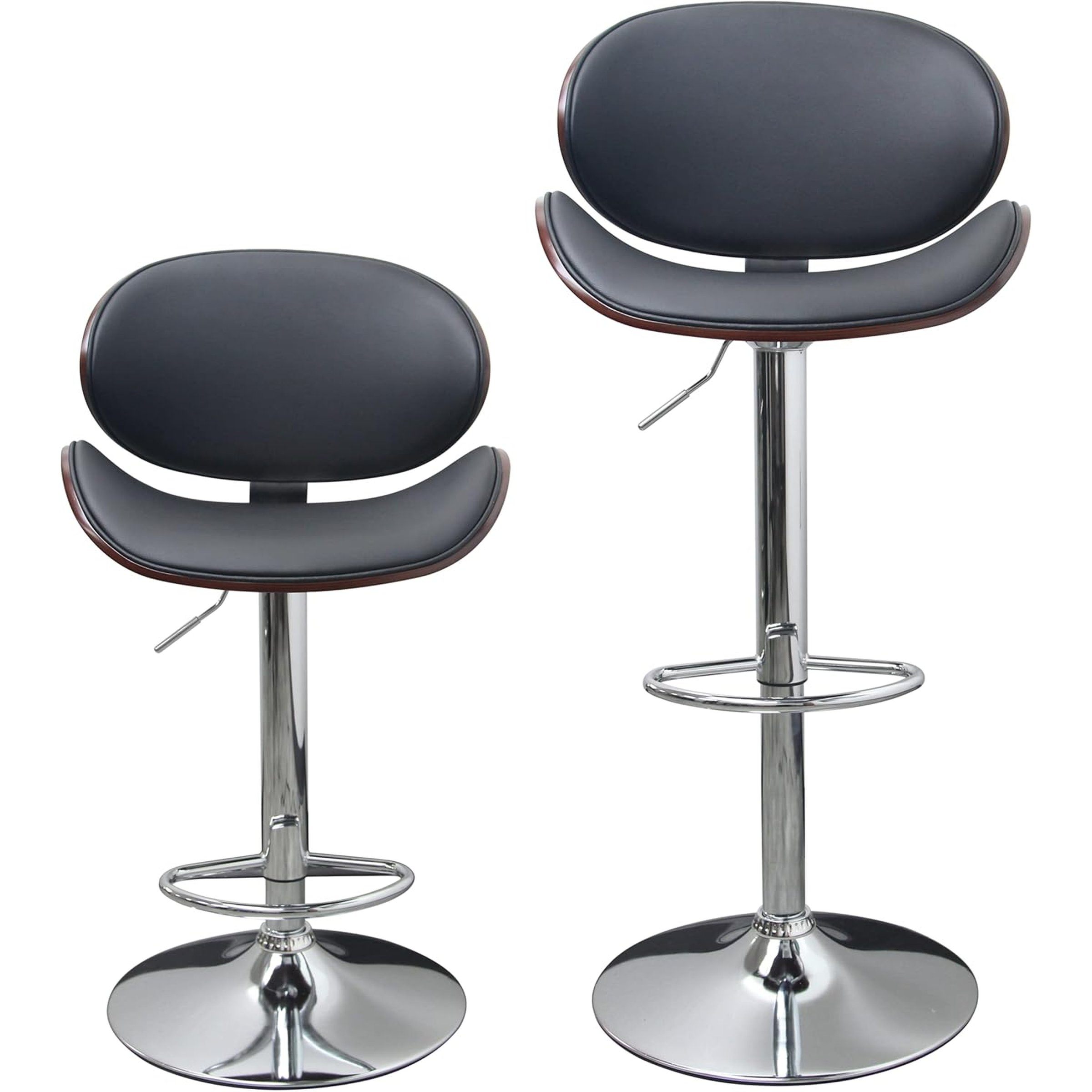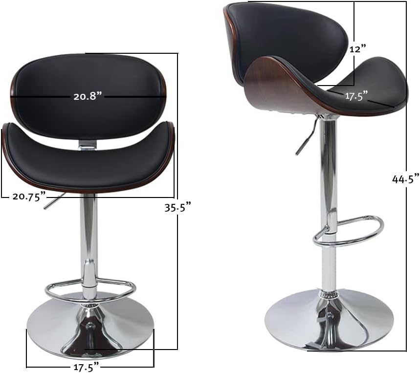 Set of 2 Curved Wood Bar Stools with Metal Base and PU Leather Upholstery, Silver and Black Metal Base Options