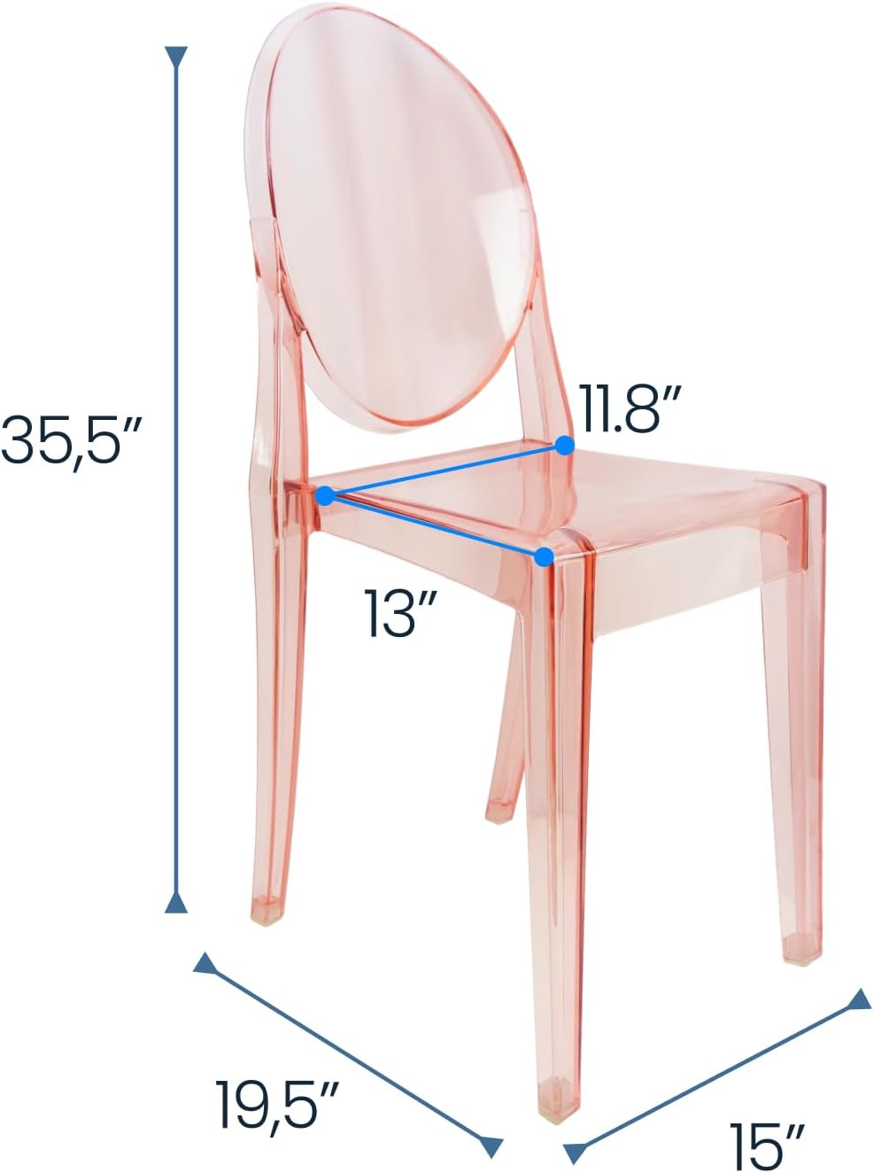 GHOST CHAIR DESIGN: Clear all the way through, without any metal hardware. Curved legs and an ergonomically rounded back support design.