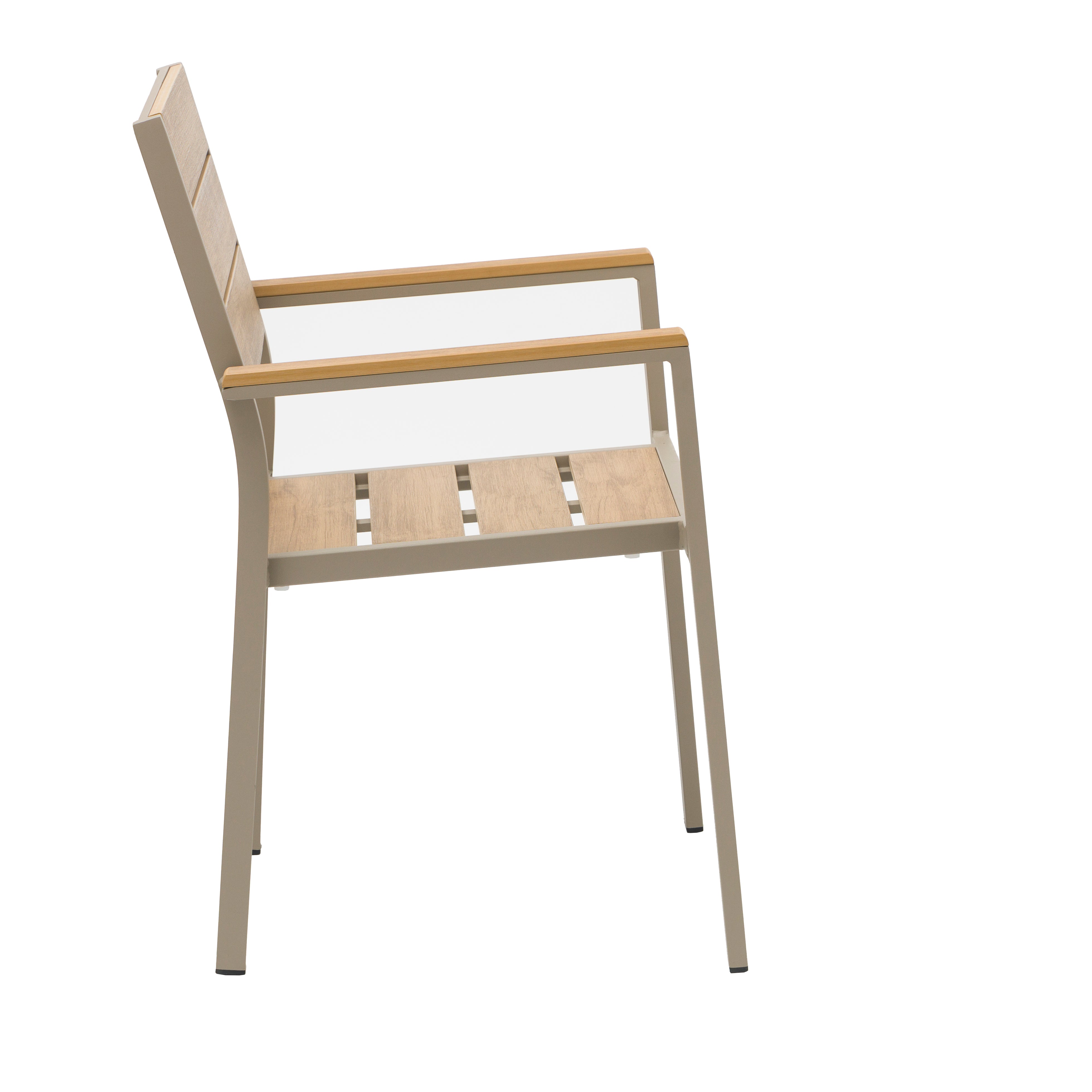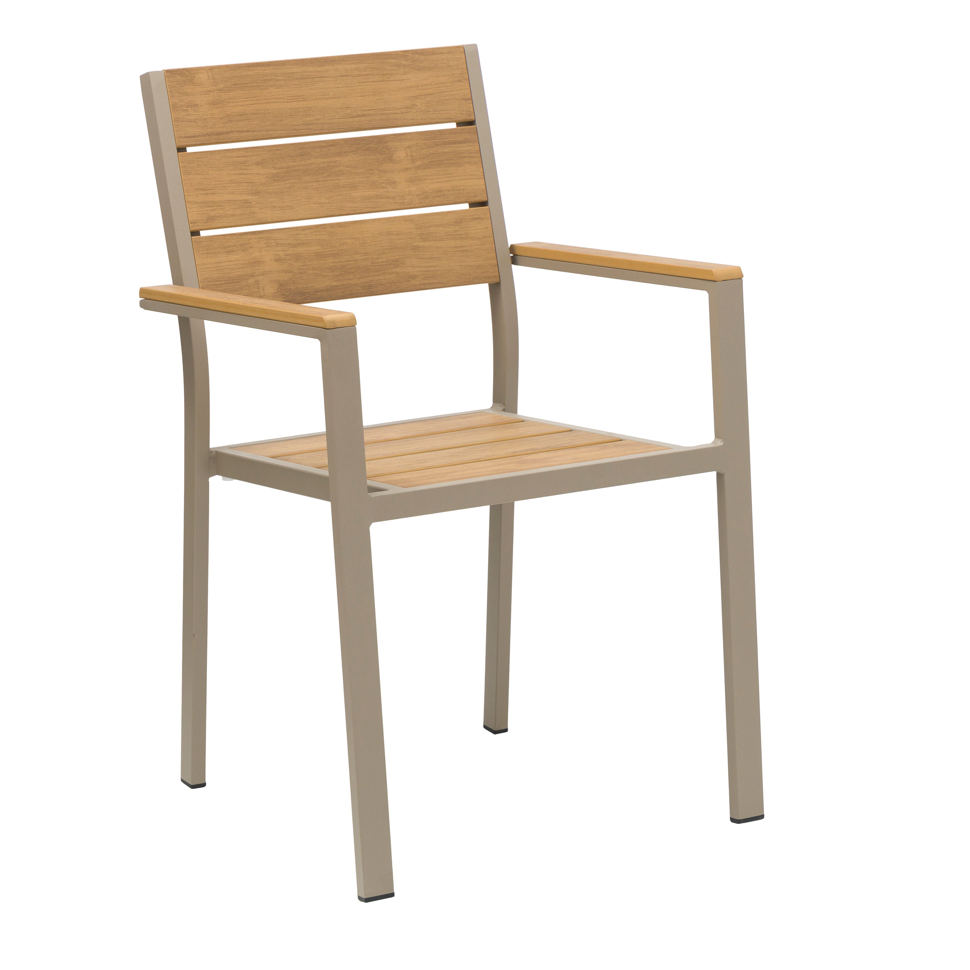 This outdoor armchair features a lightweight aluminum frame with a durable powder-coated finish, making it ideal for all-weather use. The seat, backrest, and armrests are crafted from plastic wood slats that provide the natural look of wood with added resistance to moisture, fading, and cracking. Measuring approximately 22 inches wide, 21.7 inches deep, and 33 inches high, and weighing just 12 pounds, it’s easy to move and perfect for patios, balconies, or outdoor dining areas. Built to blend comfort, durability, and modern style, this chair is a practical choice for any outdoor space.